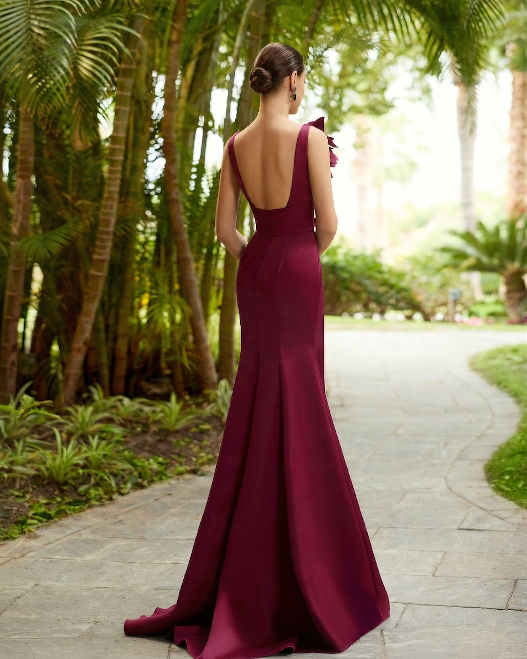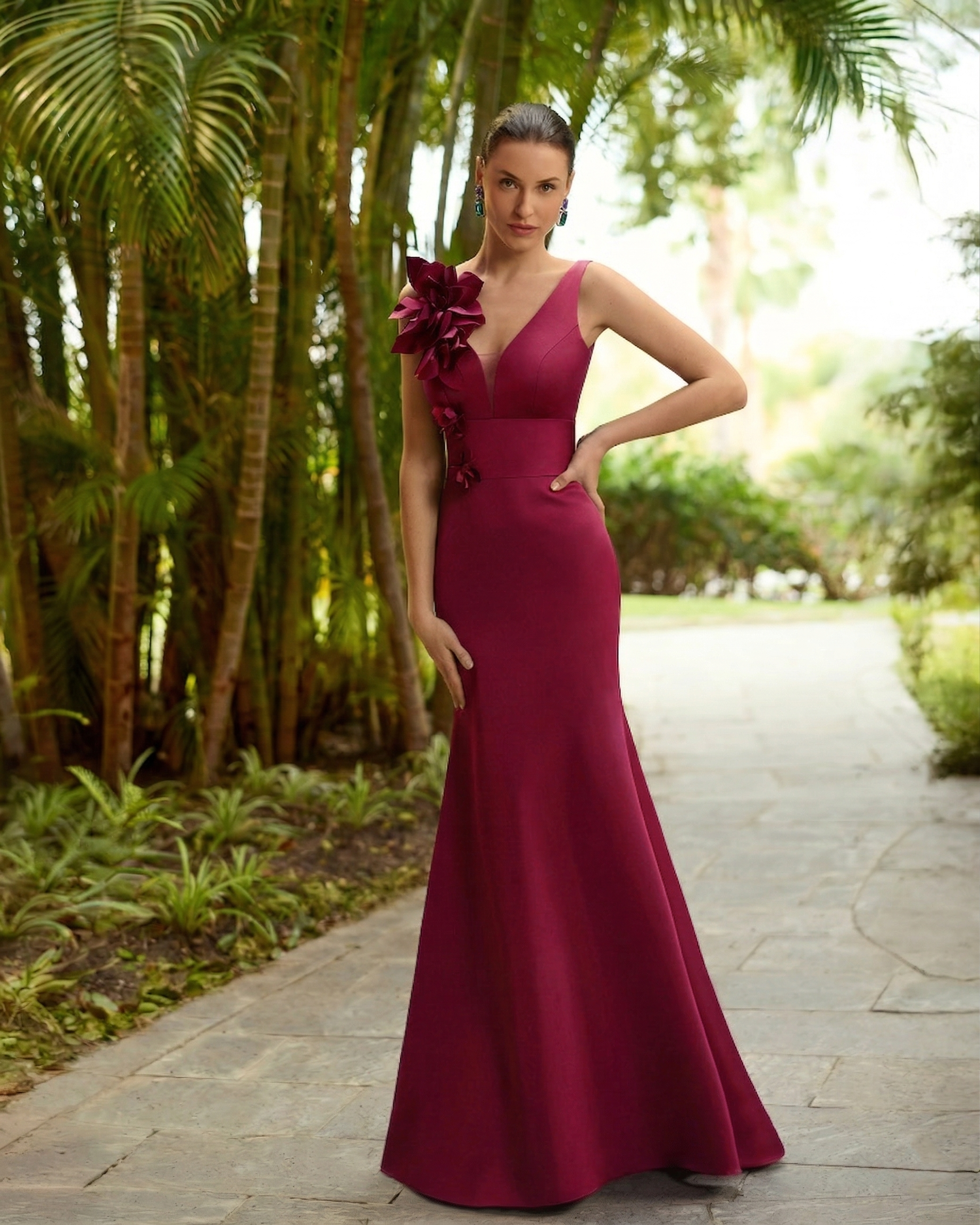 Vestido de corte sirena de fiesta largo, confeccionado en raso. Escote pico y tirantes. Espalda escotada con flores 3D hasta cintura. Chal incluido.