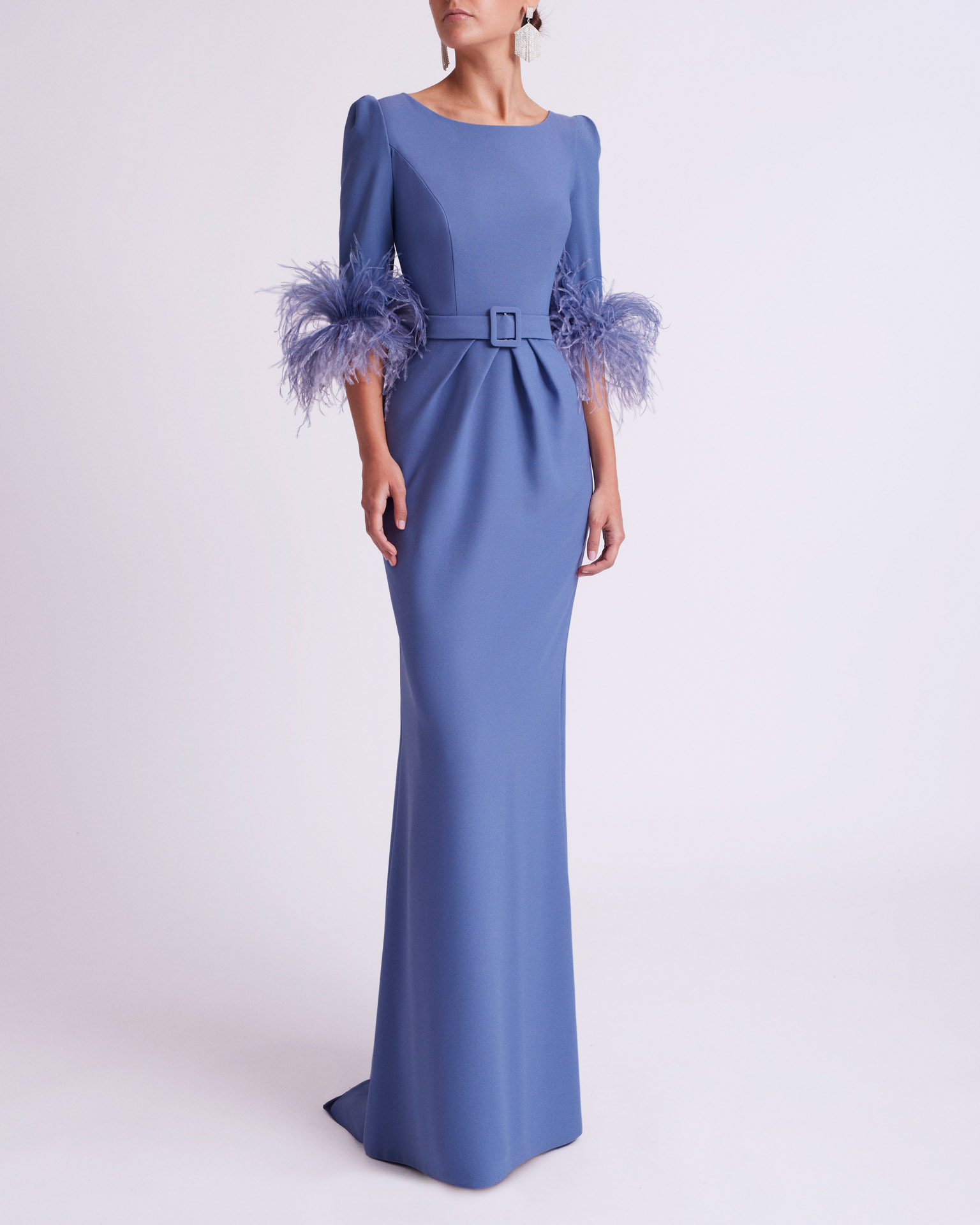 Vestido de fiesta de estilo elegante, confeccionado en crepe con manga francesa y plumas en el puño. Modelo Aire Barcelona, con escote barco y espalda cerrada tul plumetti.