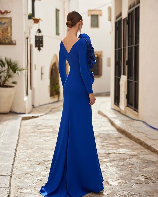 Vestido de fiesta largo y estilo elegante. Confeccionado en crepé, con escote barco y manga larga.