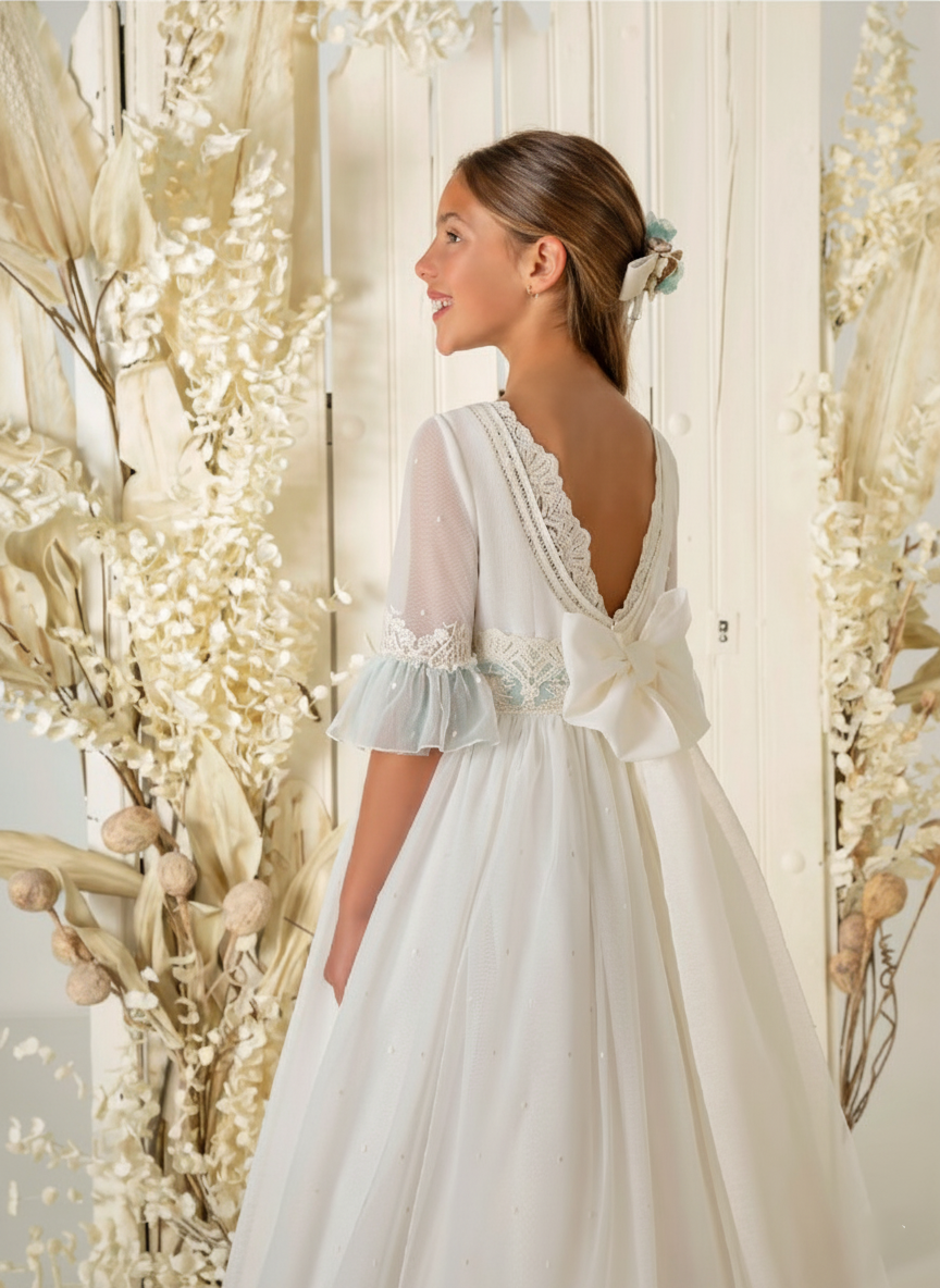 Vestido de comunión de tul bordado de estilo clásico. Leve tul aguamarina en cintura mangas. Manga francesa y lazada en color blanco en la espalda.
