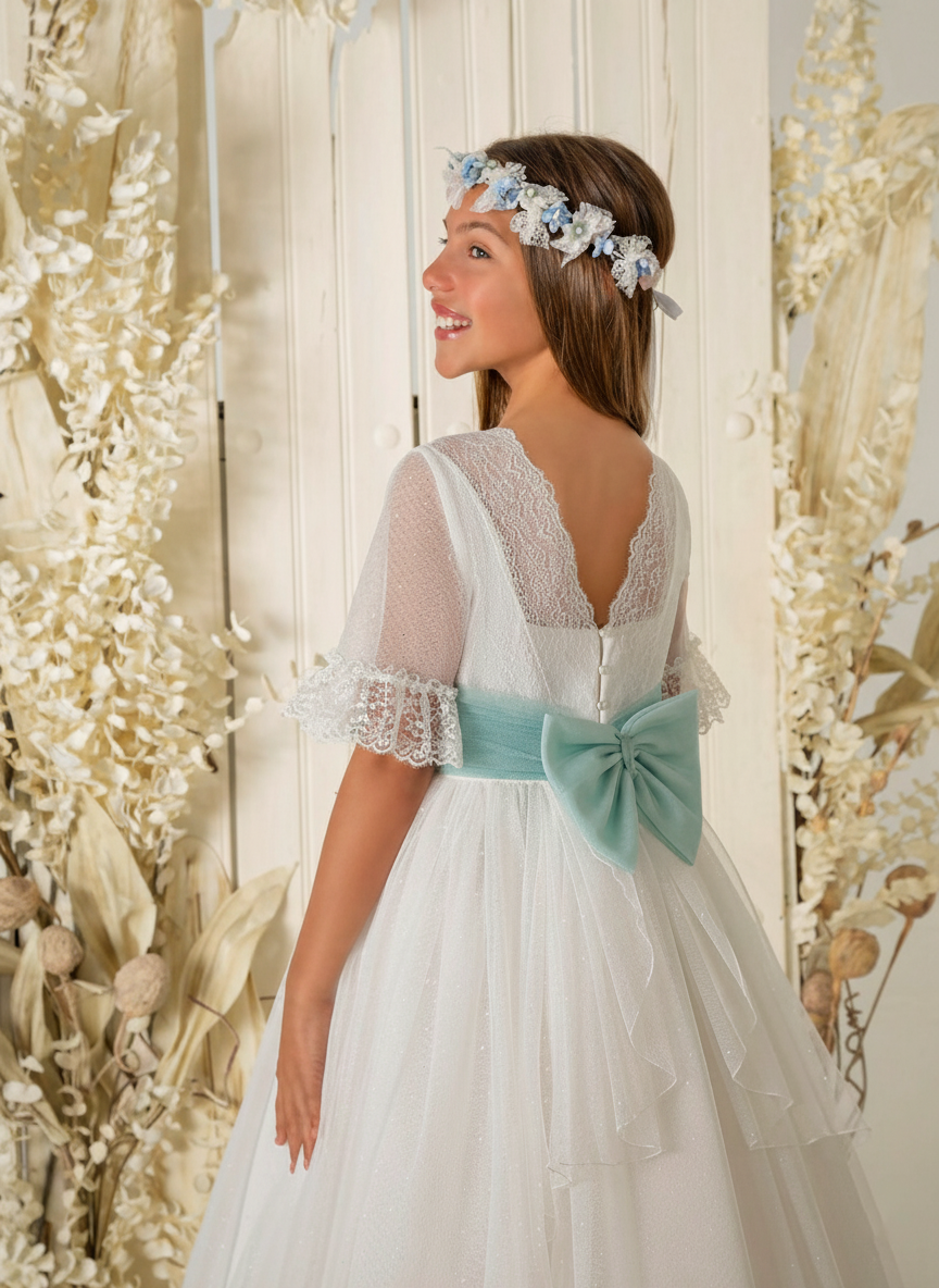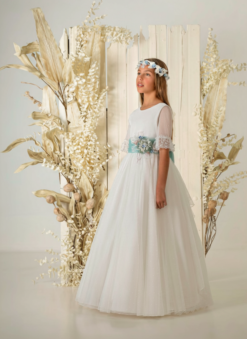 Vestido de comunión de tul topos de corte clásico. Fajín en aguamarina con lazada a la espalda y broche floral. Falda en cascada en la parte posterior.