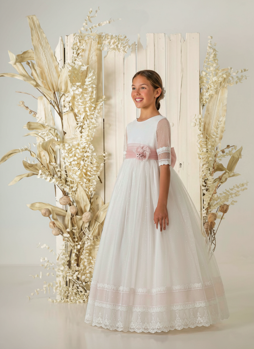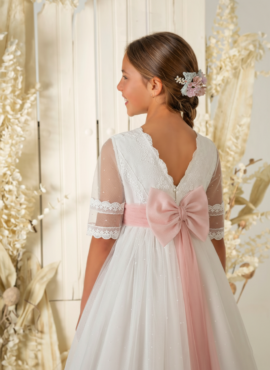 Vestido de comunión de tul topos con fajín de color rosa con flor en la parte frontal y lazo en la parte posterior. Espalda de pico y mangas de tul.