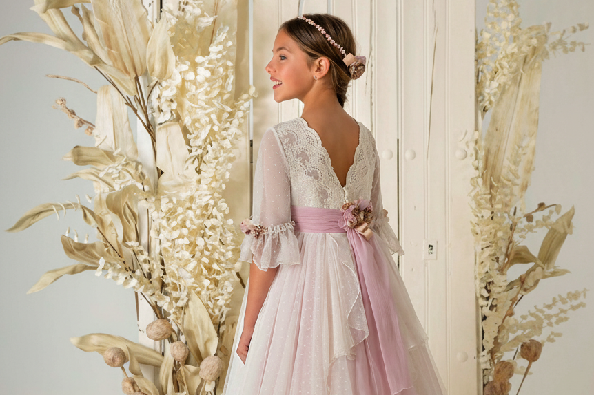 Vestido de comunión de tul bordado topos con fajín en rosa anudado con centro de flores en la espalda. Pechera de encaje y falda con cascada posterior.