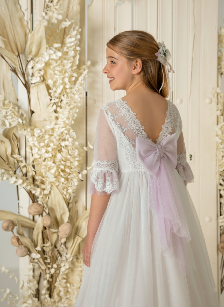 Vestido de comunión de tul topos. Espalda de pico con encaje en el borde y rematada con un lazo en color lavanda. Adorno florar en el frente de la cintura