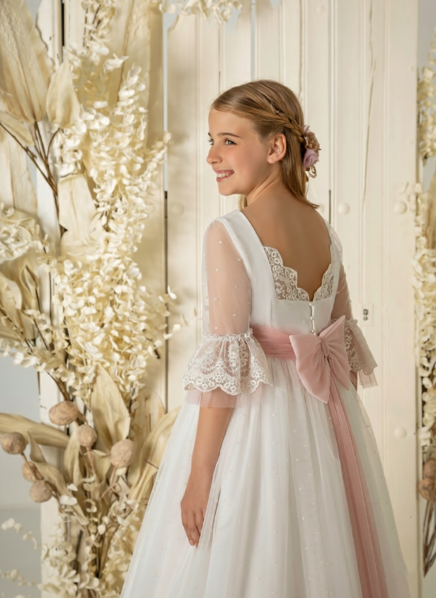 Vestido de comunión de tul bordado con fajín y falda en rosa. Dispone de sobrefalda en tul con encaje y broche de flores en el fajín.