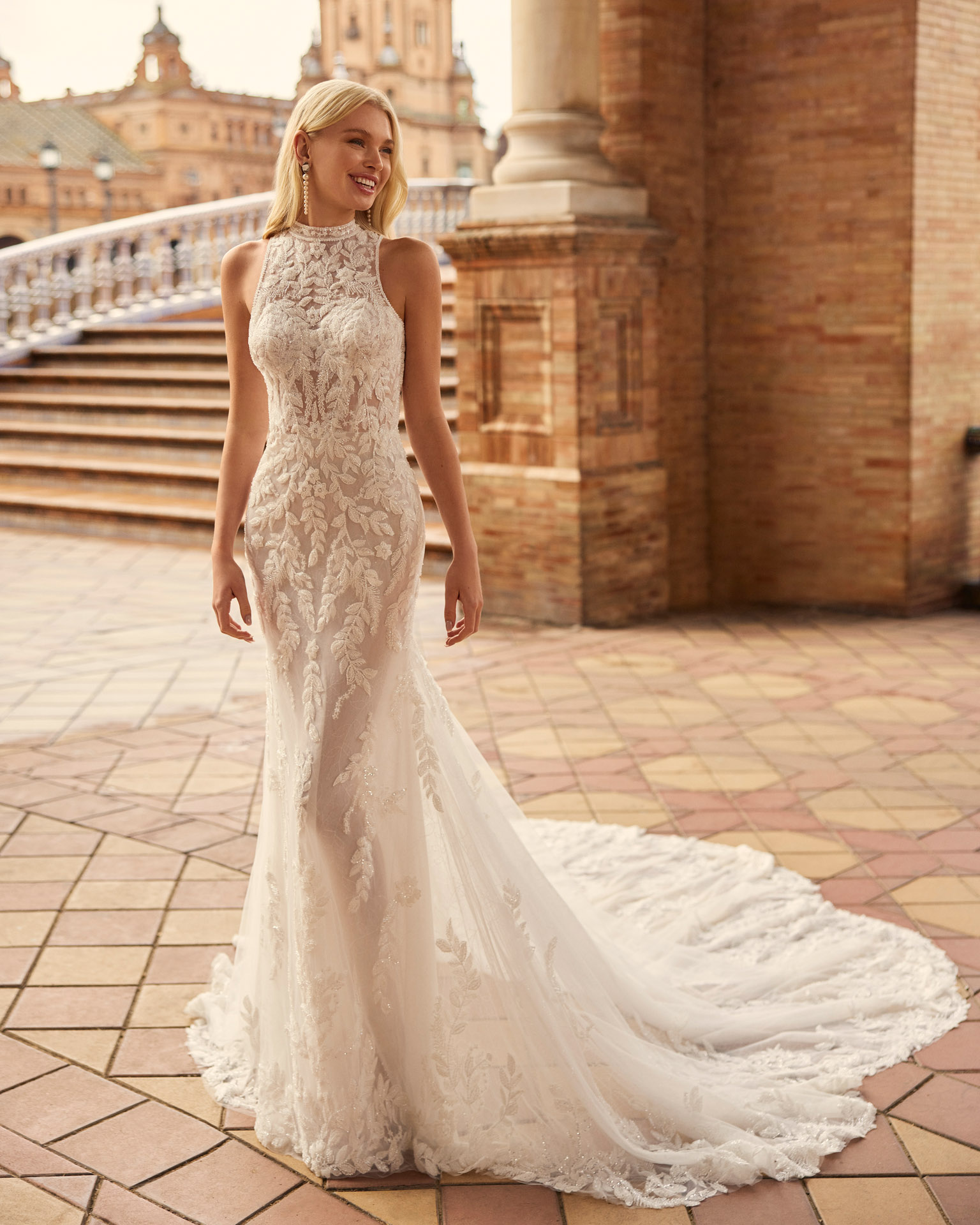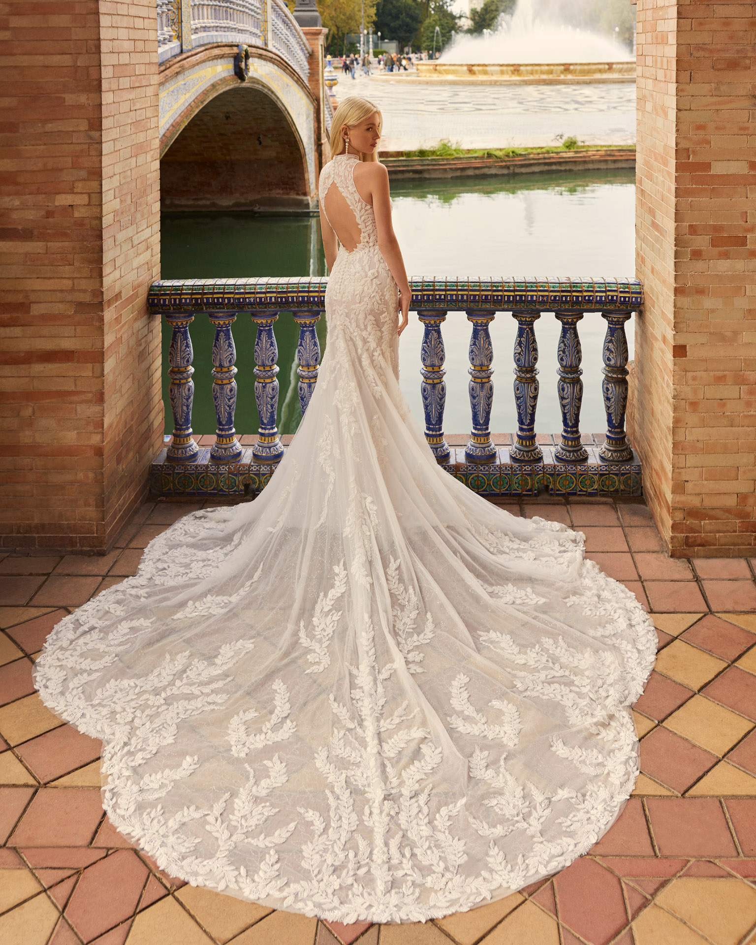 Vestido de novia, largo de silueta sirena. Elaborado con encaje, escote halter y espalda abierta.