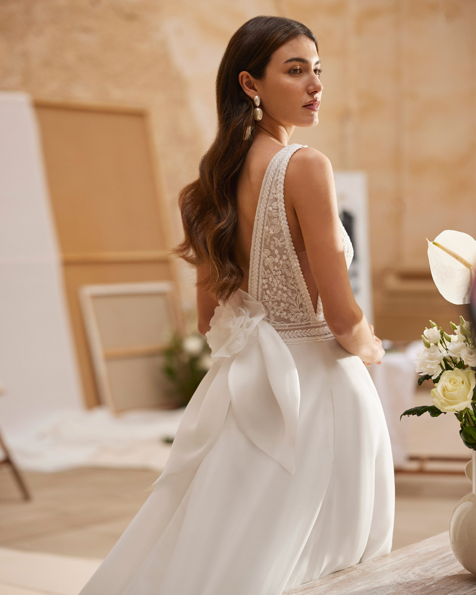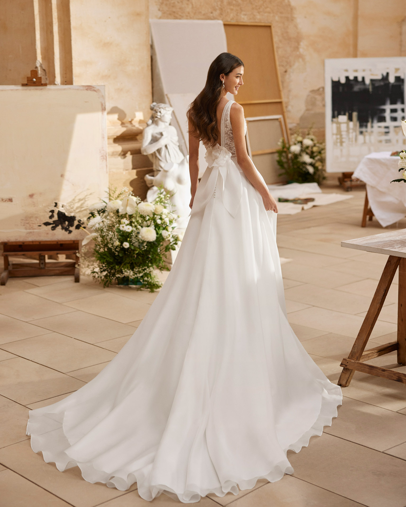 Vestido de novia, de corte volumen. Confeccionado en garza con cuerpo de encaje y pedrería. Escote pico, tirantes y espalda escotada con falda con abertura lateral.