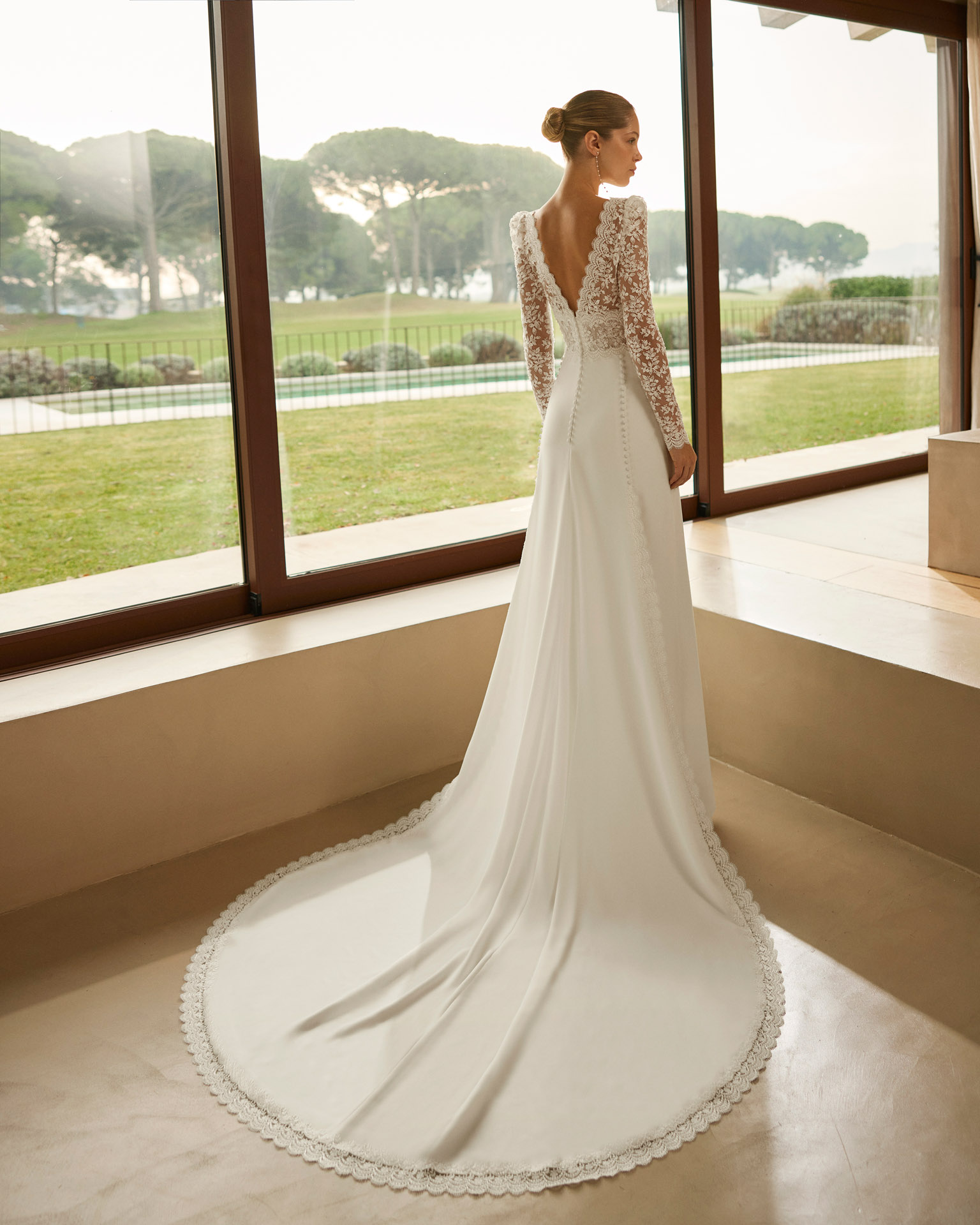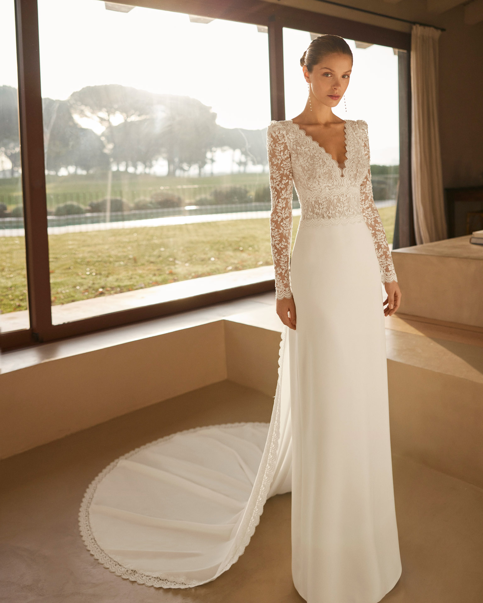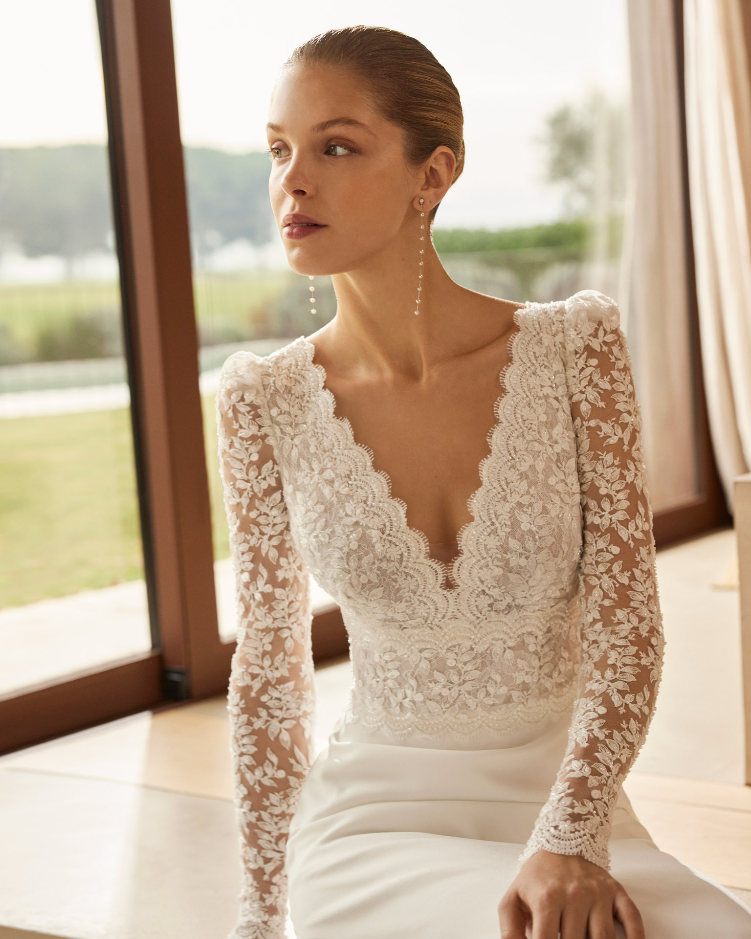 Vestido de novia, de corte recto. Confeccionado en crepé con cuerpo encaje y pedrería. Escote pico, manga larga y espalda en V.